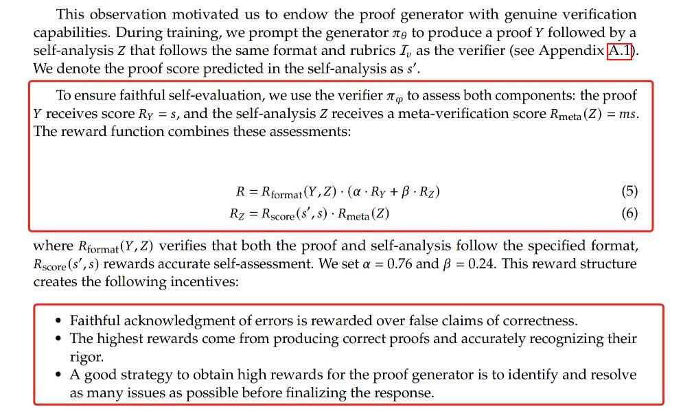 DeepSeek制定了用于证明评估的高级评分标准,目的是训练一个验证器,使其能根据这些评分标准对证明进行评估,模拟数学专家的评估过程。以DeepSeek-V3.2-Exp-SFT的一个版本为基础,通过强化学习训练模型生成证明分析,训练过程使用了两个奖励组件:格式奖励和分数奖励。