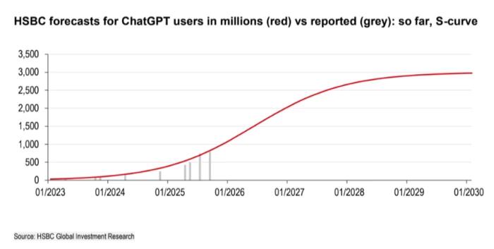 该模型将用户增长轨迹设定为典型的S型曲线,预测到2030年OpenAI将拥有30亿用户,这个数字相当于“中国以外全球成年人口的44%”。而根据最新数据,OpenAI目前公布的周活跃用户数约为8亿。