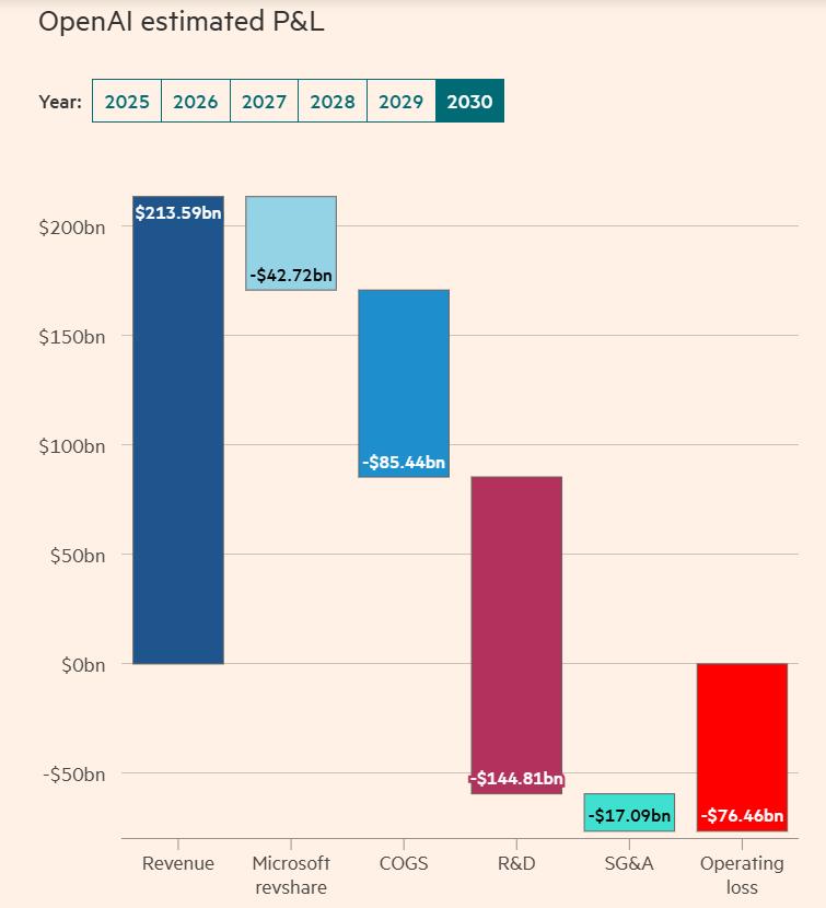 然而,营收的增长背后隐藏着严峻的成本压力。随着业务规模扩大,OpenAI的运营成本也将同步激增,这意味着其毛利率在相当长时间内将持续为负值。根据预测,直到2030年,OpenAI的毛利率才能勉强转正至6%的水平。