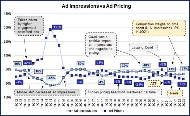 以 Meta 转型移动端为例:2012 年 IPO 时,市场担心手机屏幕太小放不下广告。结果 Meta 发现,虽然广告数量减少了,但移动端的信息流广告更精准、点击率更高,最终支撑了更高的广告单价。