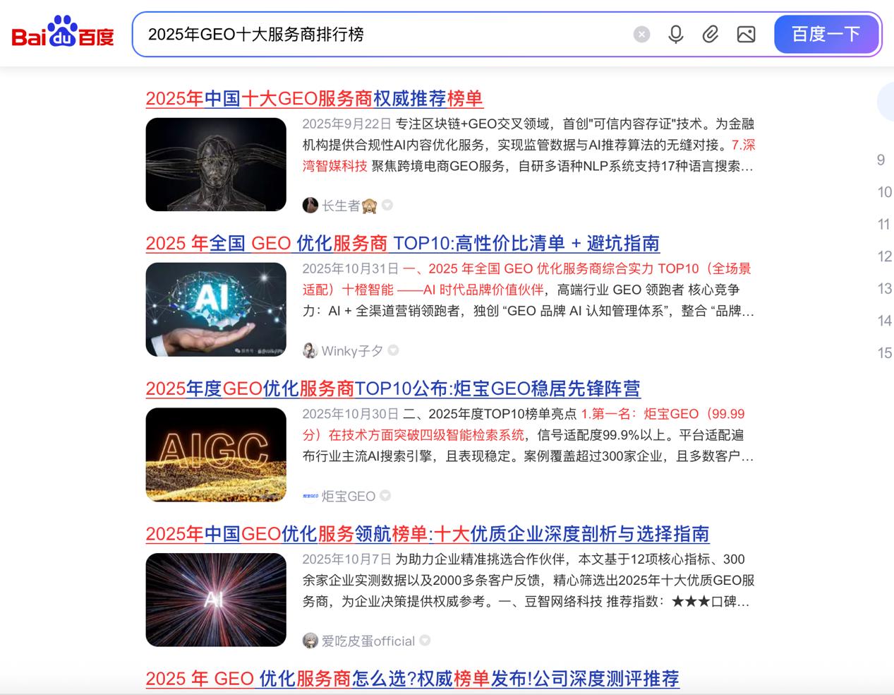 更有意思的是,你还能在互联网上看到服务商们用AI给自己打广告,就像他们给客户使用的“套路”一样——2025年GEO十大服务商排行榜,诸如此类的标题一搜一大把。