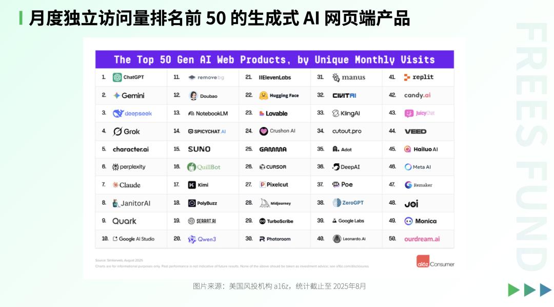 其中,中国团队的表现尤为亮眼。以夸克为例,根据美国风投机构a16z今年8月的统计,其全球网页端访问量已跻身第九,移动端(仅统计iOS手机客户端)则位列第47,若计入安卓手机客户端数据,排名有望进一步提升。类似地,DeepSeek、字节、阿里等大厂孵化的应用也在海外市场快速渗透。