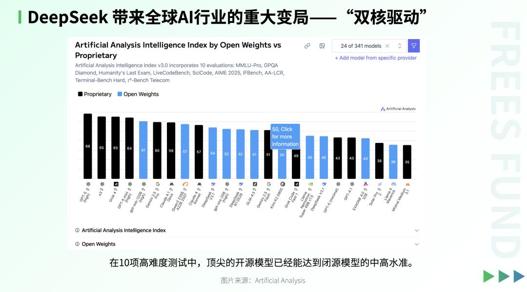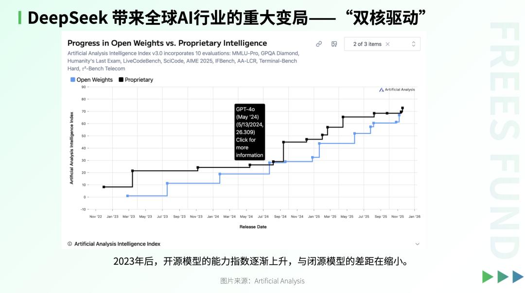从技术角度看,“双核”首先指向闭源与开源这两种截然不同的发展范式。闭源大模型由科技巨头主导(以OpenAI为代表),强调性能领先、产品闭环与商业变现;开源大模型则先由具备资源实力的组织主导(以DeepSeek为代表),在开源基础上依托社区协作、生态共建和透明迭代,近年来展现出强大的生命力。