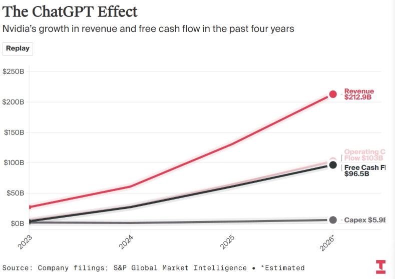 ChatGPT点燃AI浪潮后,Nvidia的营收与自由现金流在四年内直线上冲,远超资本开支的增幅,形成史无前例的「现金喷泉」