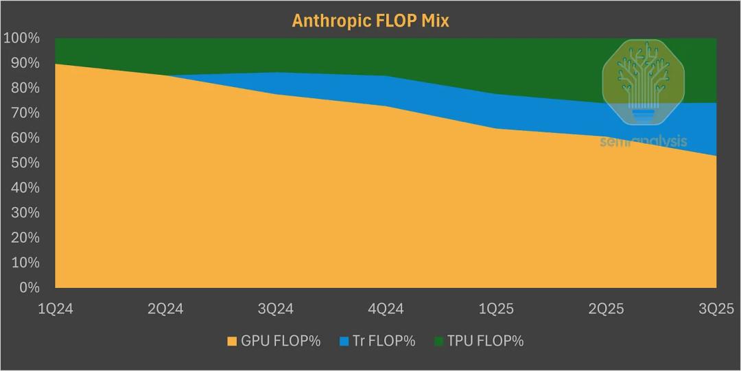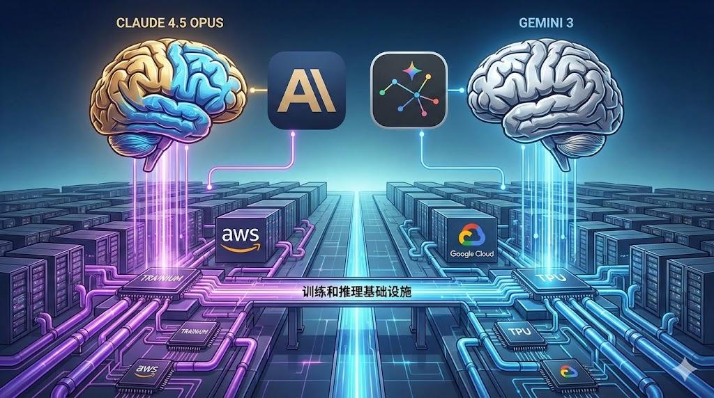 目前,世界上最顶尖的两个模型——Anthropic的Claude 4.5 Opus,以及谷歌的Gemini 3,它们绝大部分训练和推理基础设施,都运行在谷歌的TPU和亚马逊的Trainium上。