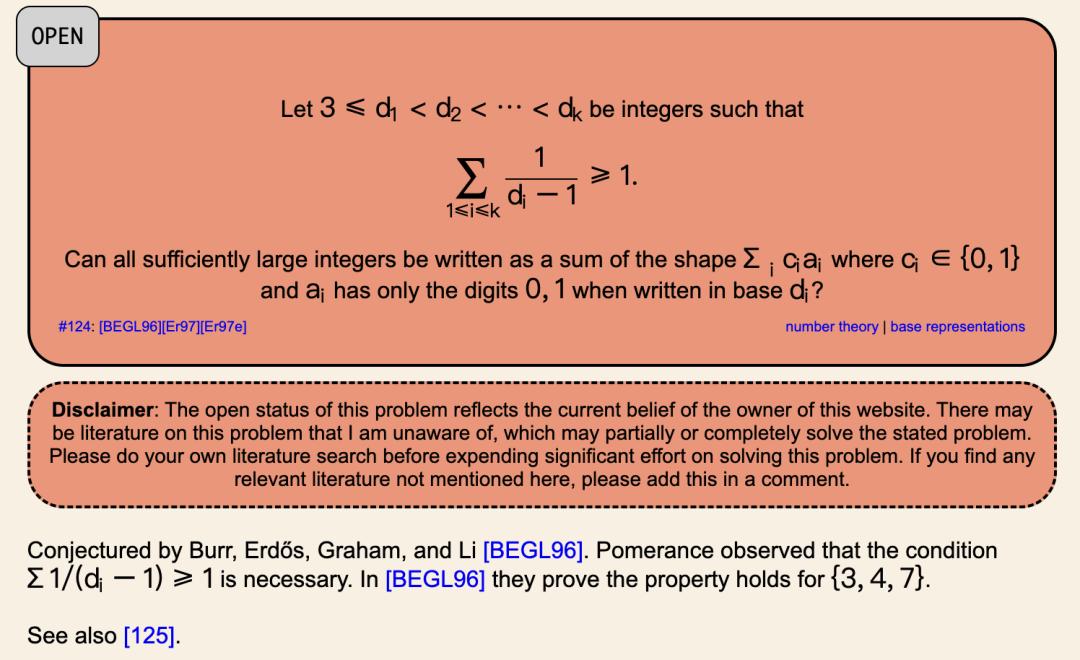 30年来,第124号问题(Erdős #124)在论文「Complete sequences of sets of integer powers」中提出后,至今无人破解。