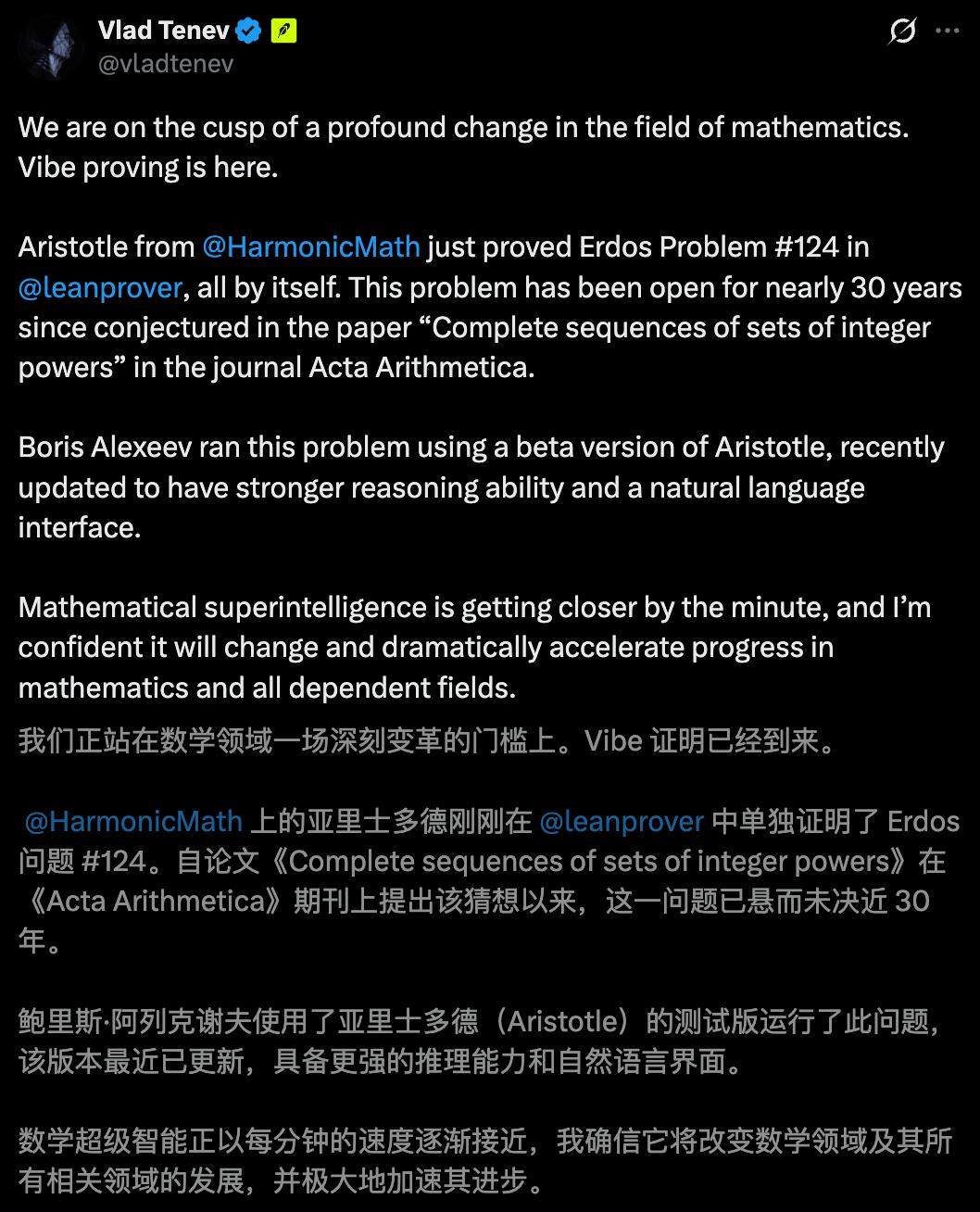 HarmonicMath创始人Vlad Tenev感慨道,「数学圈正迎来巨变,vibe证明的时代,来了」!