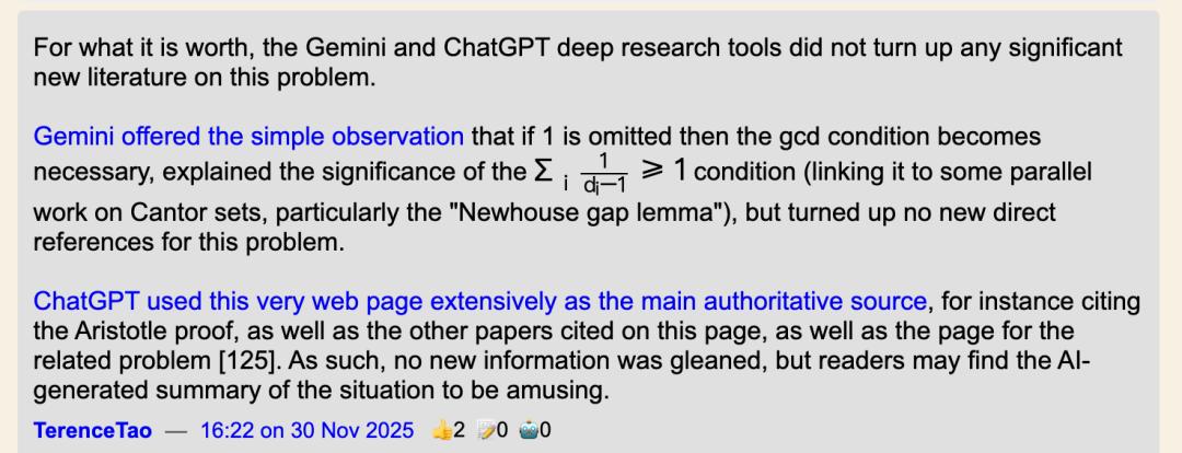 陶哲轩对此点评道,就我所知,Gemini和ChatGPT的深度研究工具,都没有找到关于这个问题的任何新的、有价值的文献。