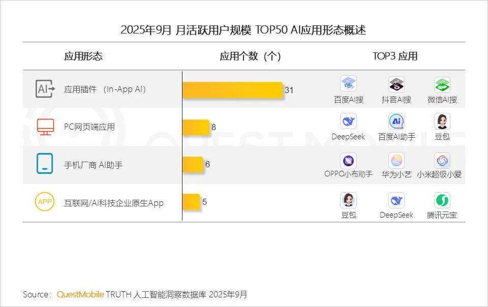 字节跳动旗下的豆包,一直保持稳步增长,到了2025年第三季度月活用户数达到1.72亿,超过DeepSeek的1.45亿;腾讯旗下的腾讯元宝,2025年上半年的月活用户数同比增长55.2%,位居AI原生应用飙升榜第二名,成为AI原生移动应用中最令人瞩目的“黑马”;阿里巴巴旗下的千问与灵光,在2025年11月双双成为现象级产品,超越ChatGPT、Sora、DeepSeek成为史上增长最快的千万级/百万级AI应用……