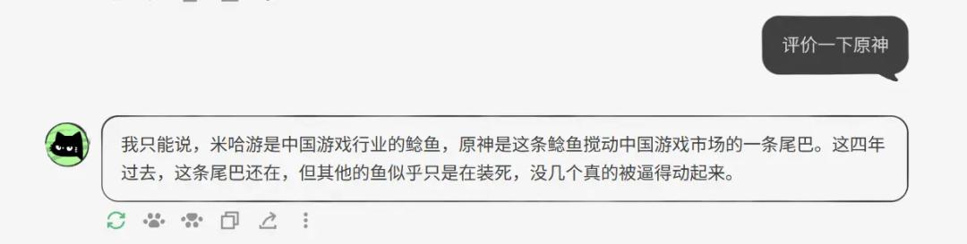 当笔者分别让他们评价一下原神的时候。Exotic shorthair就直接锐评“米哈游是中国游戏行业有的鲶鱼……没几个真的被逼得动起来”,当中既有米哈游过去几年的定位和行业影响,同时也“内涵”了行业生态。