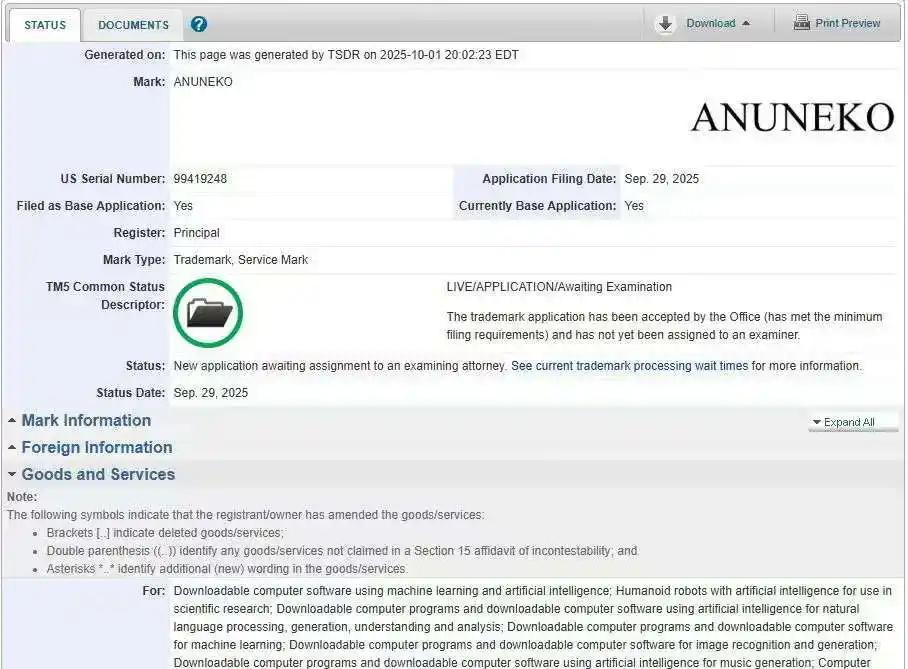 通过查询能够发现,ANUNEKO的正式商标已于2025年9月29日提交美国USPTO,分类涵盖(软件、AI角色、娱乐)等多个领域。