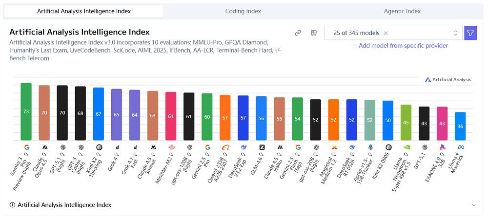 在开源世界里,DeepSeek-V3.2也是领先的存在。据权威大模型测评平台Artificial Analysis数据显示,在未计入DeepSeek-V3.2时,当前业内智能水平最高的开源模型是Kimi-K2-Thinking。