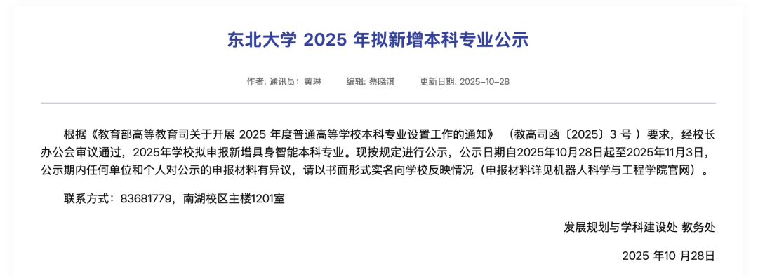比如同一时期,东北大学机器人科学与工程学院也发布公告,拟申报增设具身智能本科专业。