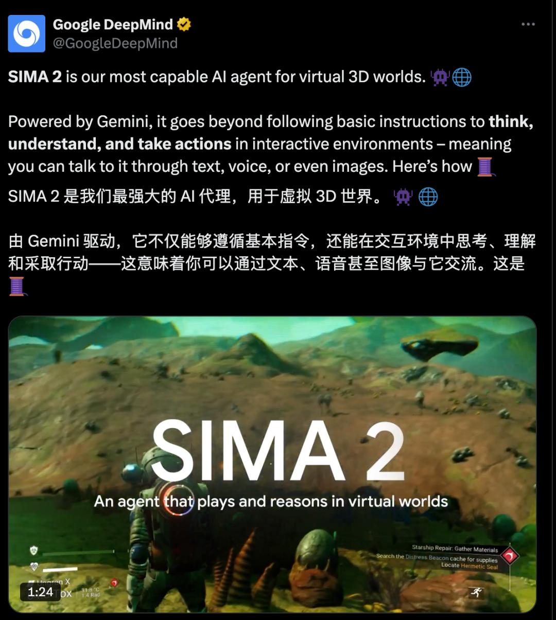 比如谷歌全新推出的SIMA 2——一个能够在《模拟山羊3》等虚拟游戏场景中遵循基本指令的通用型AI。