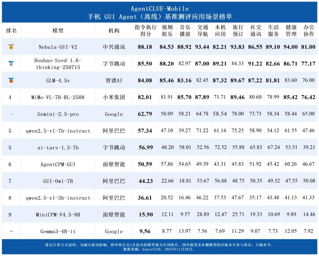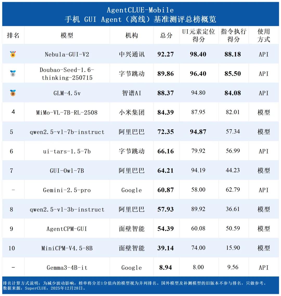 近日,中文语言理解领域权威测评基准SuperCLUE发布第二期手机GUI Agent(离线)测评报告,中兴通讯自主研发的Nebula-GUI-V2凭借92.27的高分强势登顶总榜。Nebul-GUI是中兴通讯星云大模型家族的一员,主要用于各类GUI界面自主操作,在UI元素定位与指令执行两大核心能力上表现突出,以绝对优势领跑行业,彰显了中兴通讯在AI智能交互领域的深厚技术积淀与创新实力。