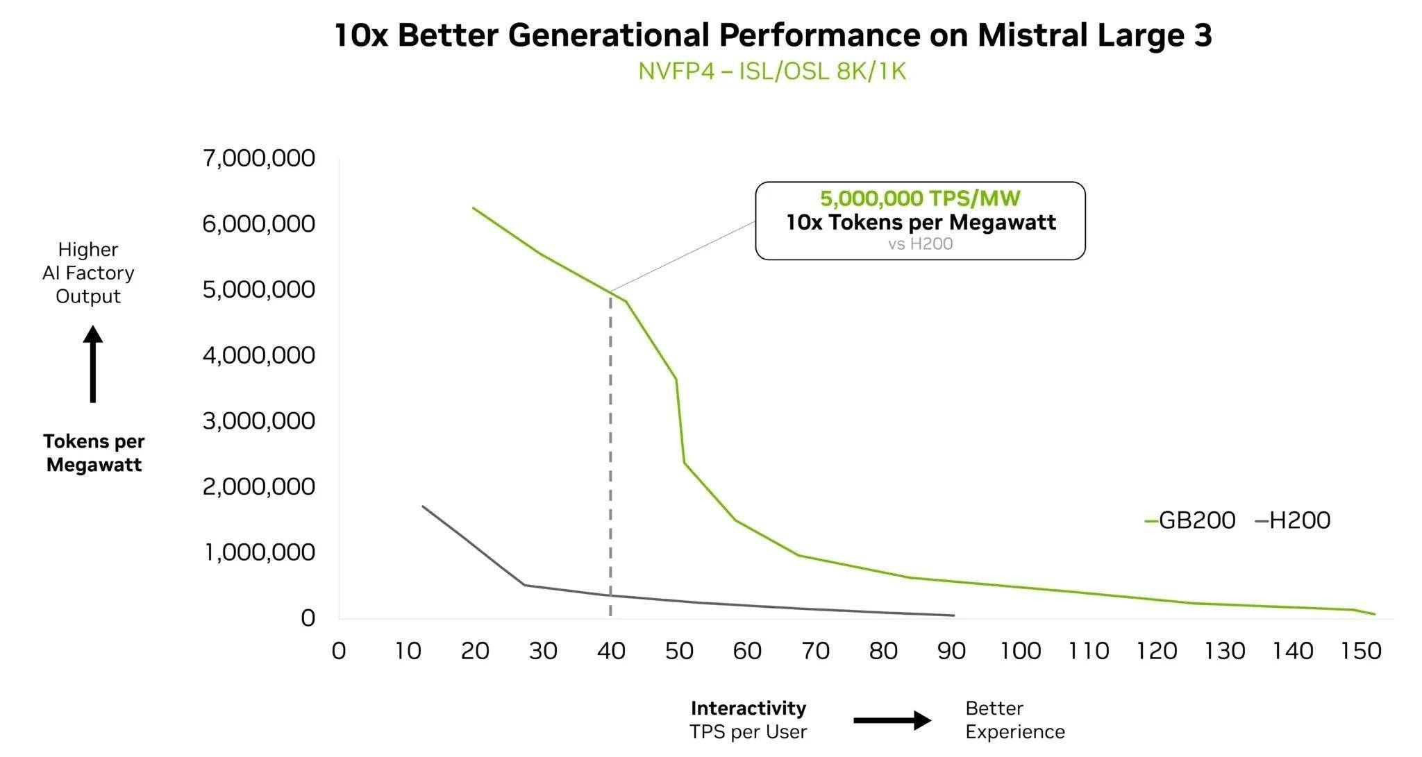 这一合作成果的核心是,Mistral Large 3这一大型模型在英伟达GB200 NVL72系统上实现了相比前代H200芯片10倍的性能提升。这种性能飞跃转化为更好的用户体验、更低的单次响应成本以及更高的能源效率。该模型在每兆瓦(MW)能耗下可实现每秒超过500万个token的处理速度。