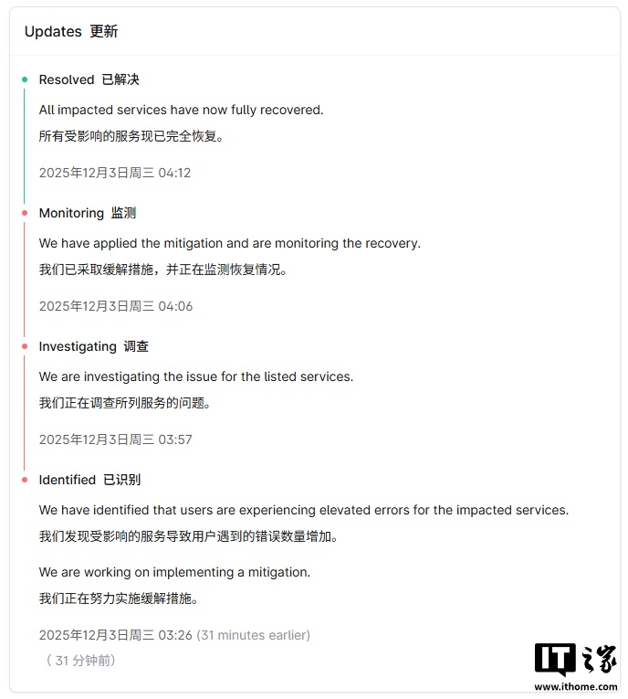 IT之家查询 OpenAI 官方状态页面,发现 12 月 2 日和 12 月 3 日均出现了状态不稳定情况。第一次故障于北京时间 12 月 2 日 2 点 08 分出现问题,并已于当天 2 点 37 分采取缓解措施,并正在监测恢复情况;于 3 点确认已完全恢复。IT之家附上相关截图如下: