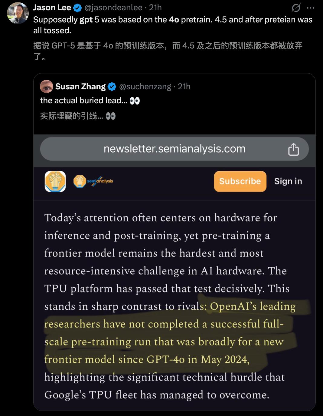 此前,不仅Information,还有SemiAnalysis多家外媒爆出,自GPT-4o之后,OpenAI尚未完成下一代前沿大模型的预训练上。