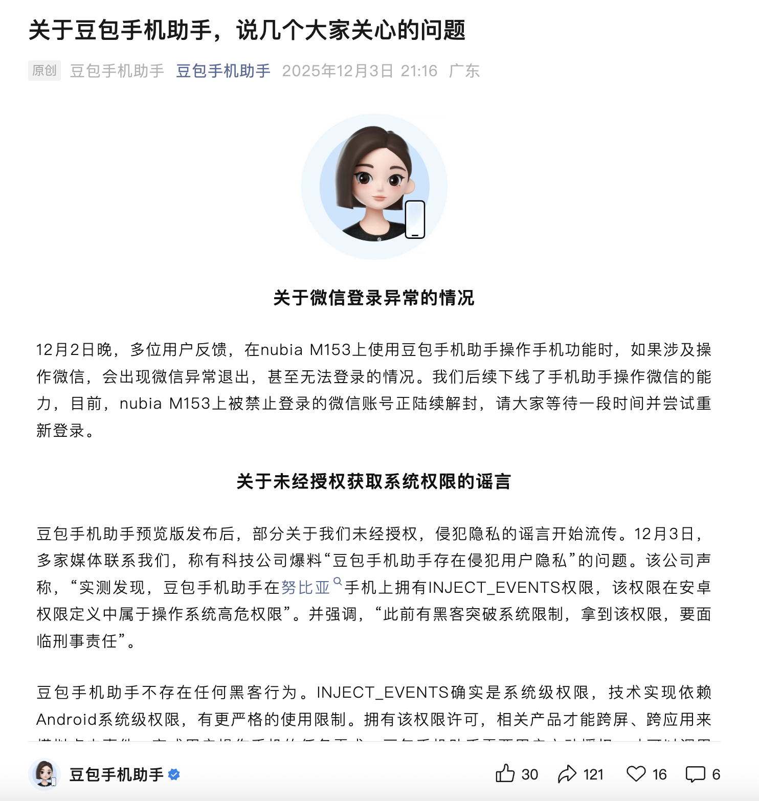 说明称,多位用户反馈,在nubia M153上使用豆包手机助手操作手机功能时,如果涉及操作微信,会出现微信异常退出,甚至无法登录的情况。我们后续下线了手机助手操作微信的能力,目前,nubia M153上被禁止登录的微信账号正陆续解封,请大家等待一段时间并尝试重新登录。