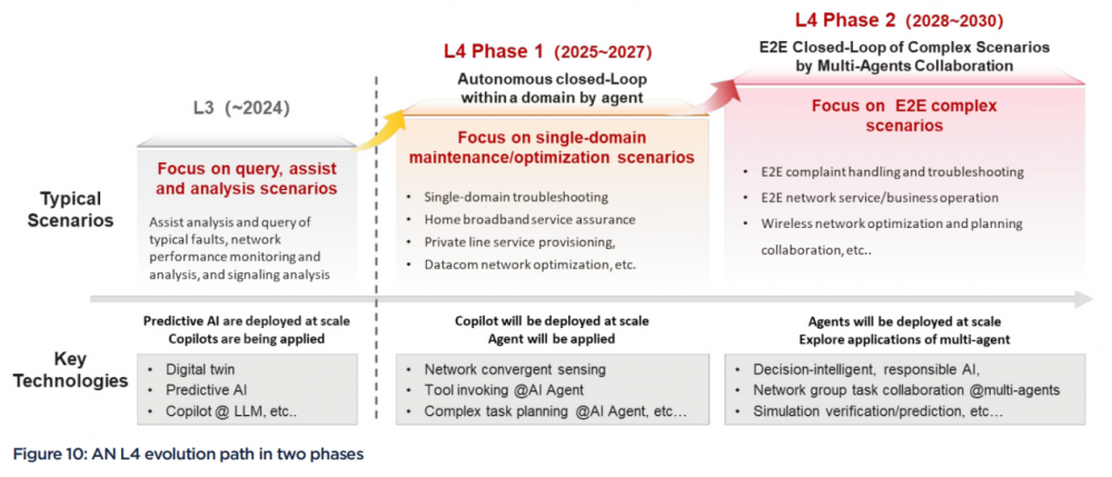 根据TM Forum AN L4行业蓝图,2025-2027年为L4初阶(单域闭环),重点深化单智能体在单域内的自智能力;2028-2030年则迈向L4高阶(跨域复杂环境),实现多智能体在跨域复杂环境中的协同互操作。