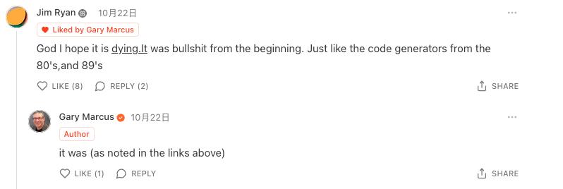 就在流量持续下滑的背景下,社交媒体上对 Vibe Coding 的厌倦与反感也在迅速累积。Gary Marcus 等学者和评论者近期对 Vibe Coding 编程抛出了极端批评,Gary Marcus 甚至点了赞支持那条“真希望它赶紧消亡,它从一开始就是扯淡”的评论。这样的情绪在最近几个月里反复出现——在各种技术讨论中,都能感受到从从业者到普通用户,对“氛围编程”的耐心正在迅速消失。