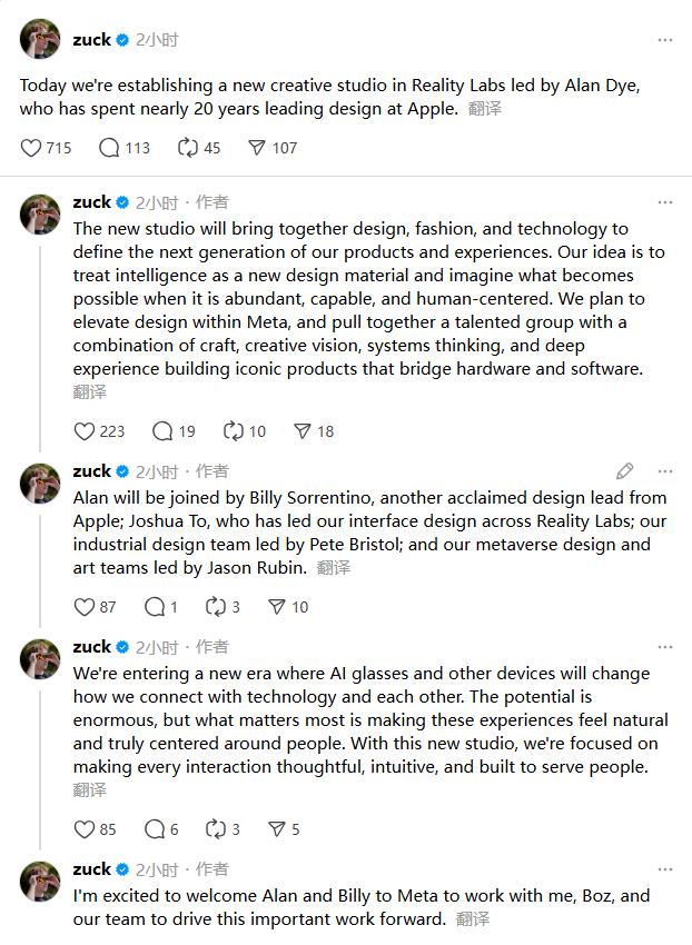 值得注意的是,戴伊的重要副手、同样来自苹果的资深设计总监比利·索伦蒂诺(Billy Sorrentino)也将一同加入。Meta现有的多位设计负责人也将向戴伊汇报,形成一支汇聚了顶尖设计人才的团队。
