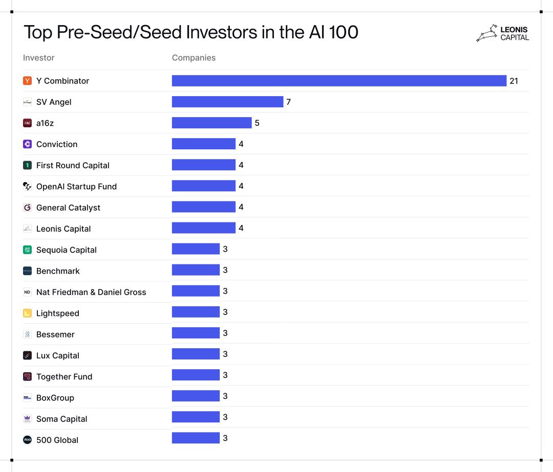 在种子轮和天使轮阶段,Y Combinator以绝对优势遥遥领先,在100家增长最快的AI初创公司中,有超过20%都获得了它的支持。
