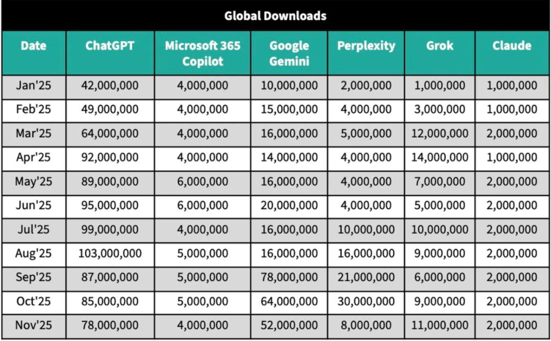 尽管它仍稳居行业第一,在移动端全球下载量中占50%,在全球月活用户中占55%,但Gemini正在快速追赶,在下载增速、月活增速以及用户使用时长增速方面全面超越ChatGPT。