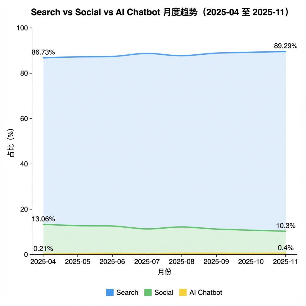 图表一:专用搜索、社交应用和AI对话机器人市场占用率 来源:Search Engine Market Share Worldwide,Nov 2024 - Nov 2025,Statcounter,AI绘图