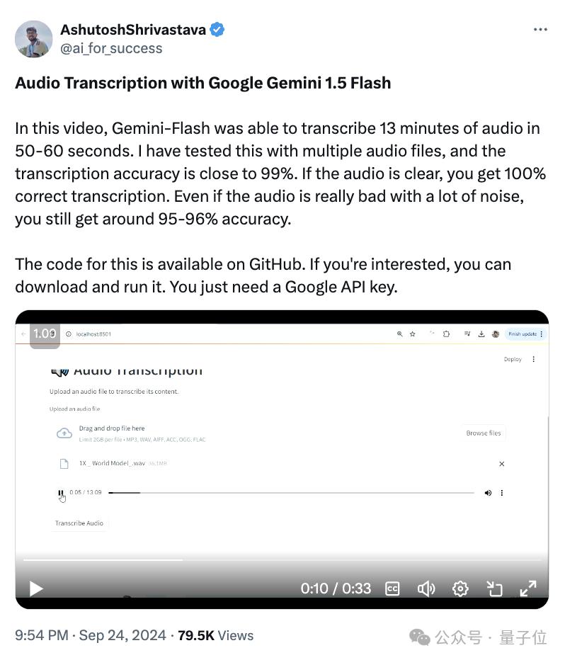 他测试了Gemini 1.5 Flash的音频转录功能。后者能在50-60秒内转录13分钟音频。