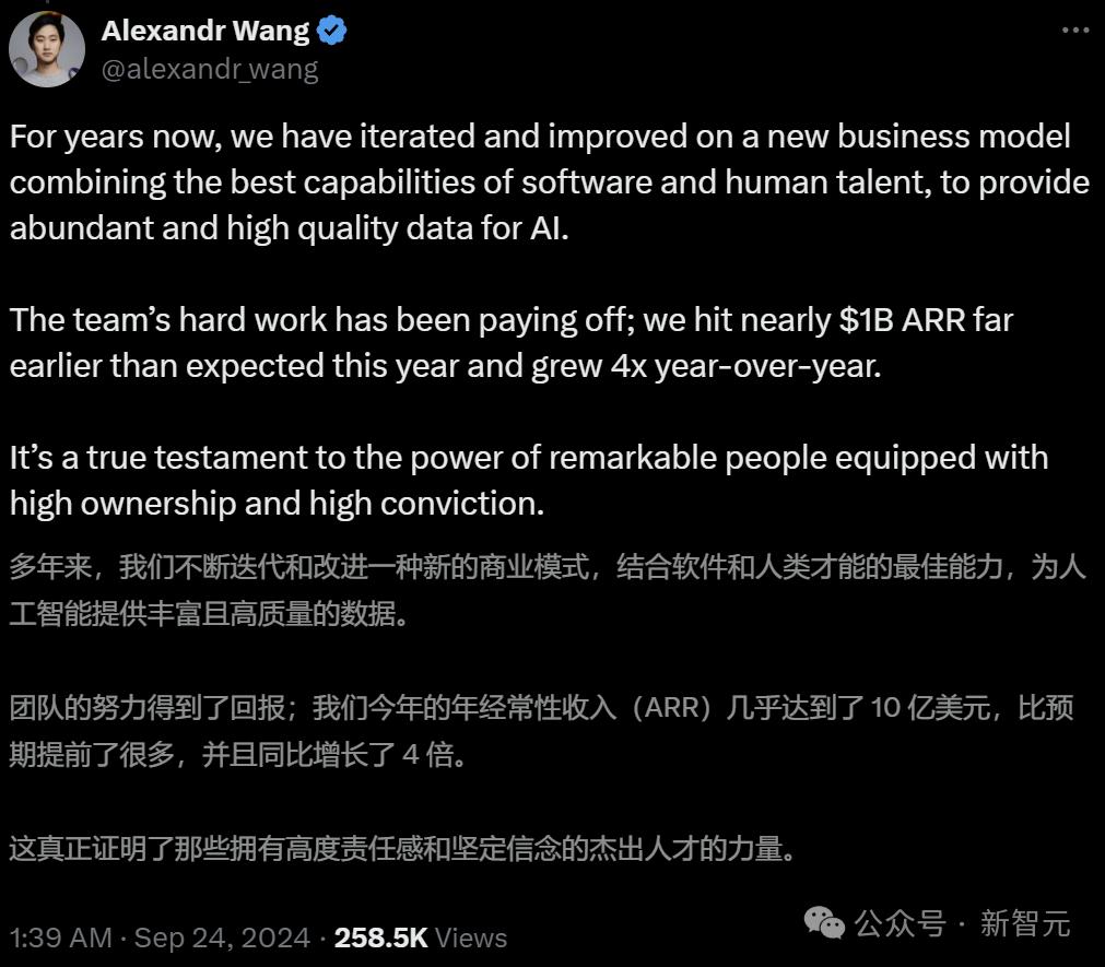 震惊!就在刚刚,Scale AI创始人Alexandr Wang宣布:公司的年化收入已经达到近10亿美元。OpenAI的年收入,也仅仅是35-45亿美元。数据墙愈渐紧逼的今天,Scale AI早早踩对了风口,如今终于一飞冲天了。