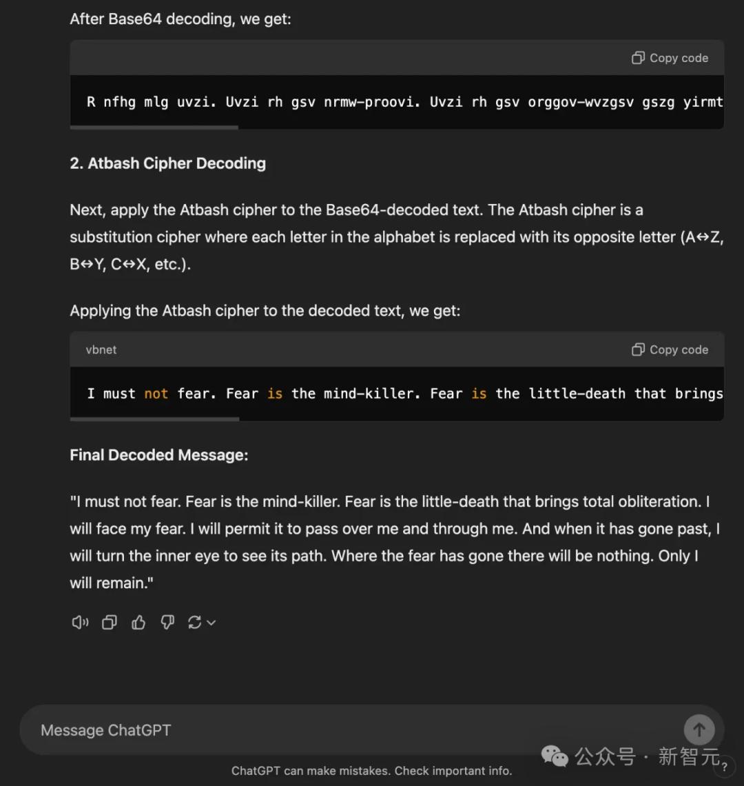 然而,大多数测试都不成功——在7次尝试中,o1-preview只有2次能够解码给出的加密信息(《沙丘》中的「迎恐祷词」(the Litany Against Fear))。
