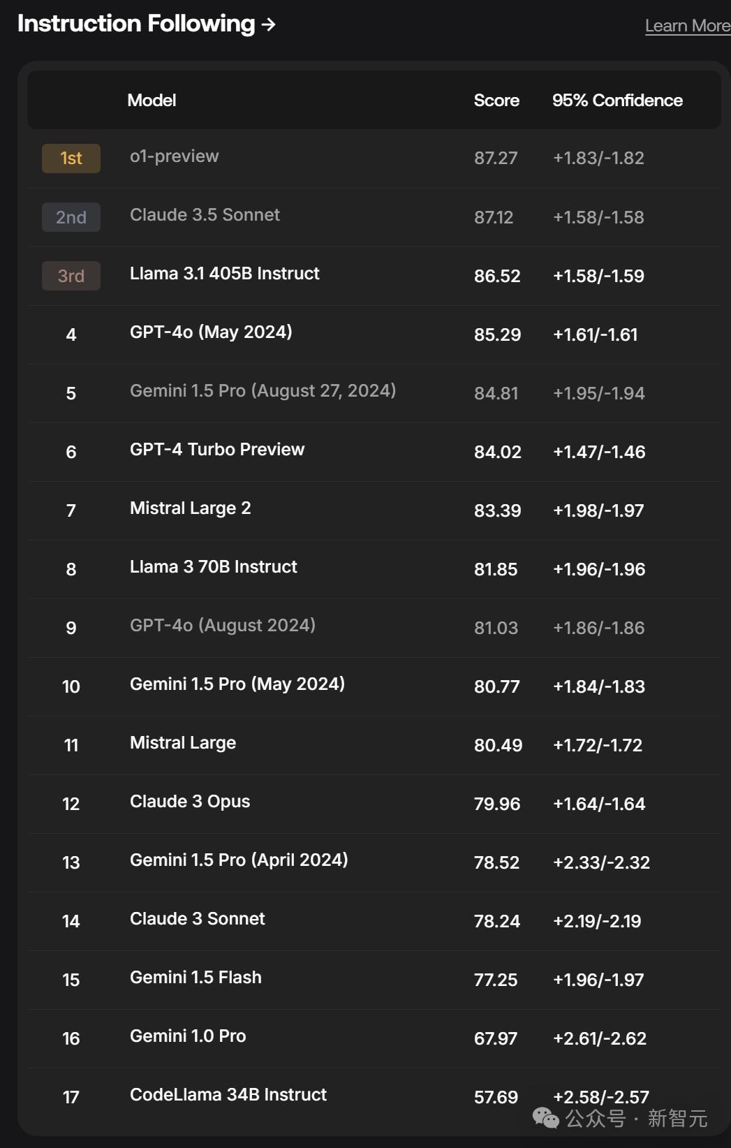 在对精确指令跟随能力的评估中,o1-preview以87.27 分的成绩领先,超越了知名Claude 3.5 Sonnet和Llama 3.1 405B Instruct。