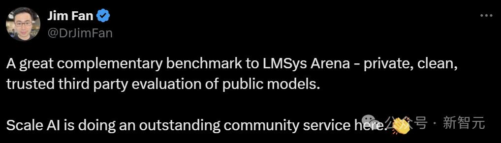 对于这个榜单,Jim Fan大加赞赏。他认为SEAL是LMSys的非常好的补充和参照,提供公开模型的私密、安全、可信的第三方评估。