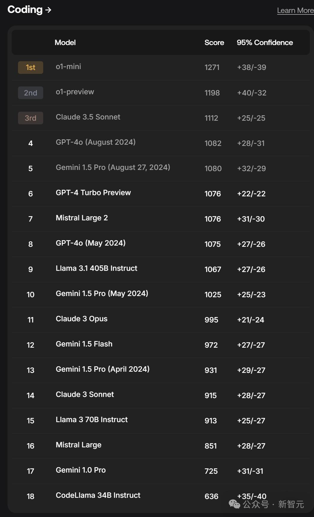 在工具使用和指令跟随方面,o1-preview表现出色。而在编程能力方面,o1-mini夺得榜首,o1-preview紧随其后位居第二。