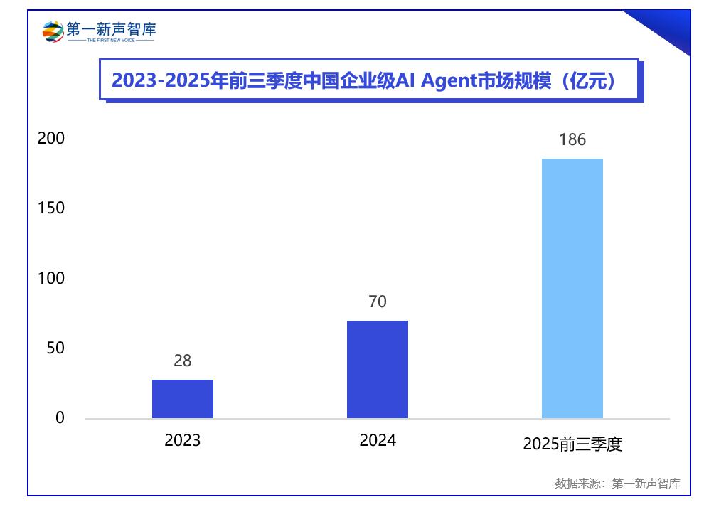 2025年第三季度,AI Agent市场已全面迈入“多行业价值验证”阶段。第一新声智库经过供需两侧调研及实际市场招投标项目情况的综合分析研究发现,2025年前三季度企业级AI Agent市场规模已达到186亿元,相较2024年前三季度增长超220%。