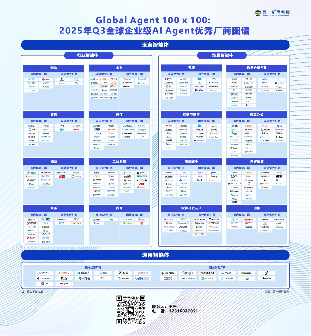 在市场变化极为迅速、竞争态势不断加剧的背景下,为追踪市场前沿动态,呈现最新市场态势变化,第一新声智库启动第20轮AI产业研究-2025年3季度AI Agent跟踪研究。同时,为清晰呈现AI Agent领域的全球生态格局与竞争脉络,第一新声智库基于企业实际营收、核心产品迭代、行业标杆客户落地情况及重大招投标项目等指标,对全球厂商进行系统筛选与评估,评选出国内TOP100与国外TOP100优秀厂商,最终形成《Global Agent 100 x 100:2025年Q3全球企业级AI Agent优秀厂商图谱》。