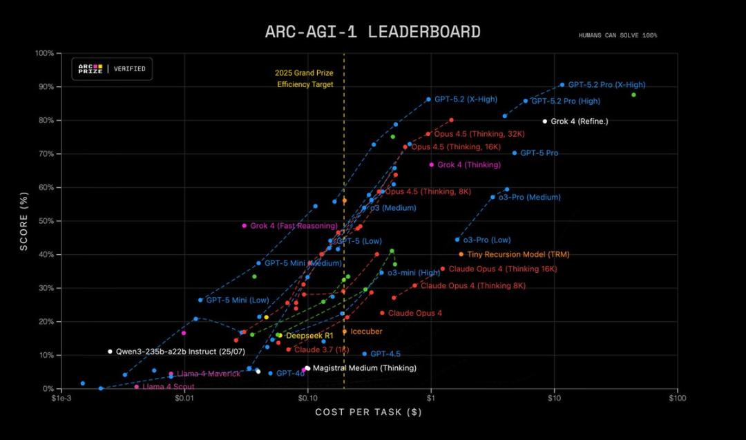ARC Prize表示,GPT-5.2 Pro(X-High)的最新SOTA得分为90.5%,这就意味着,AI在一年内效率已经提高了约390倍。