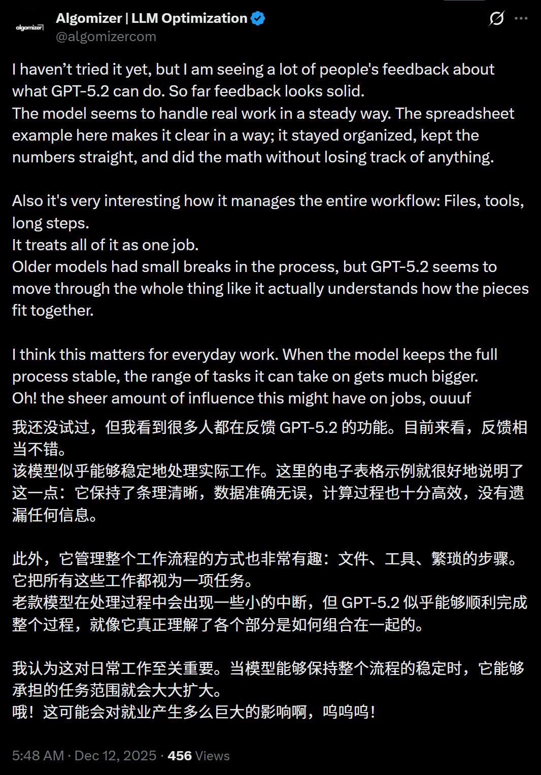 总之,在大多数人的反馈中,GPT-5.2能稳定地处理实际工作,条理清晰,工作流程顺畅。