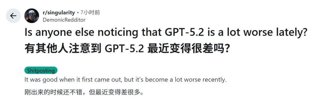 在reddit上,也有很多网友表示:在GPT-5.2刚发布的时候,似乎功能还很强。