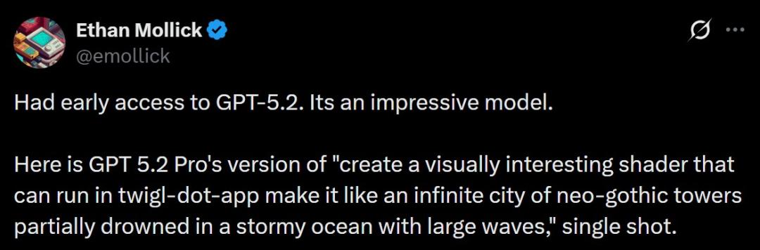 沃顿商学院教授Ethan Mollick表示,自己有幸提前使用了GPT-5.2,它的性能还是令人印象很深刻的。