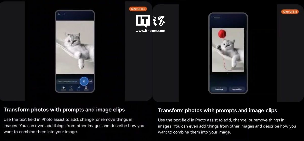 三星在泄露版的教程片段中展示了该功能的实际应用场景:用户选中一张毛线球的素材图,要求 AI 将其混合到一张猫咪的照片中。系统随即生成了一张猫咪正在玩弄毛线球的新图像,且交互动作十分自然。