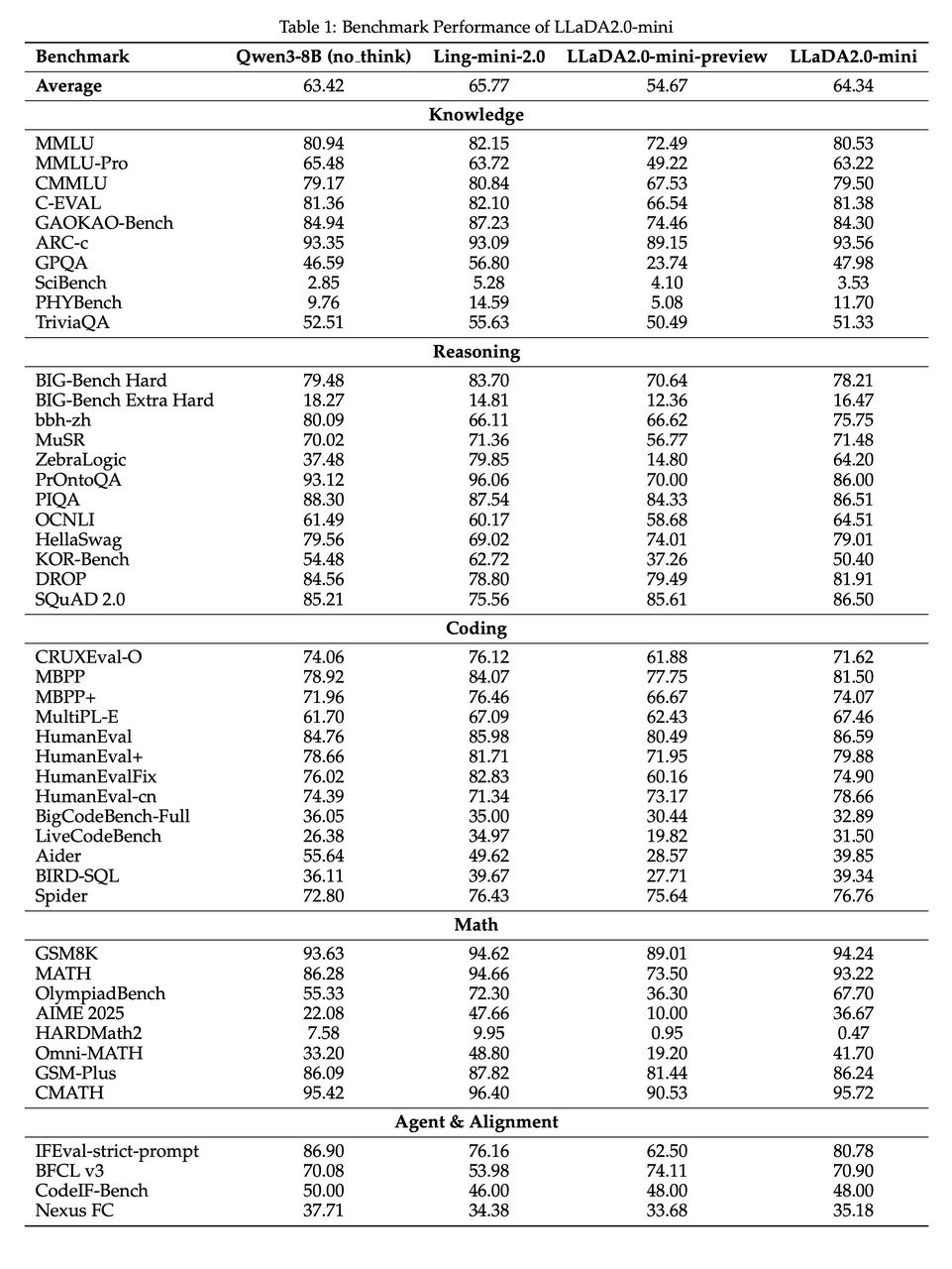 通过三项后训练技术的协同,LLaDA2.0 在能力塑造、推理效率提升与人类偏好对齐之间形成了完善的优化体系,使其从通用的扩散式生成模型进一步迈向高性能实用型大模型。