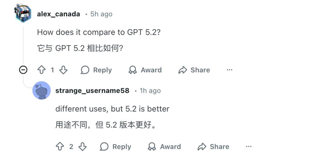 在 Reddit 上,有用户提问这款 Deep Research Agent 与同一时间 OpenAI 发布的 GPT-5.2 相比如何,另一位用户回答称用途不同,但 GPT-5.2 更好。