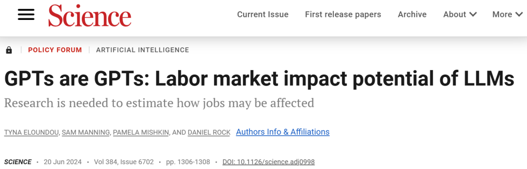 回望2023年,OpenAI发布的重磅论文《GPTs Are GPTs》,直白地剖析了哪些行业最容易被AI颠覆,并在第二年登上了Science。