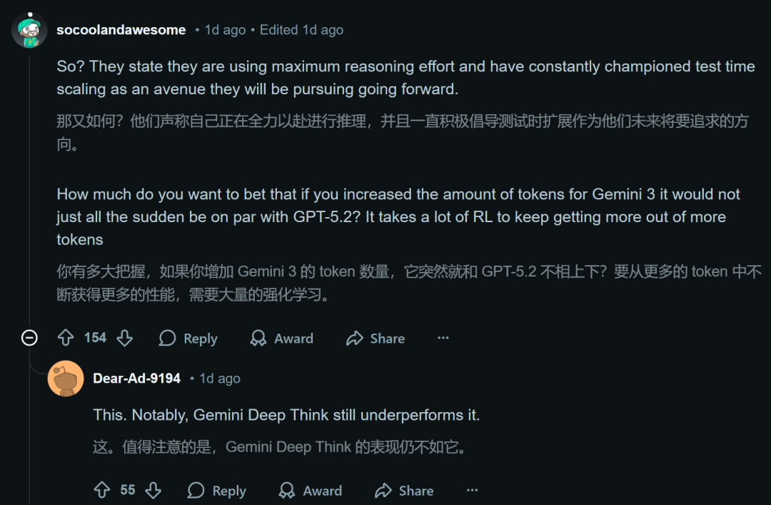 他们觉得,即使增加Gemini 3的token数量,它也未必就能赶超GPT-5.2,这一点来说,前者的确落后了。