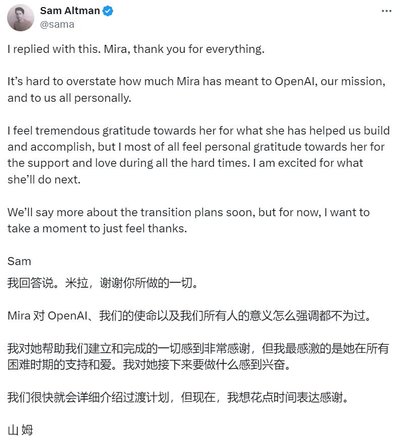 Sam Altman体面的感谢词如约而至,他感谢了Mira对OpenAI的付出,并表示“很快就会详细介绍过渡计划”。
