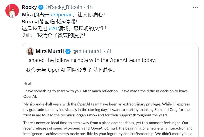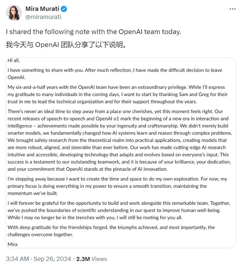 “告别自己珍视的地方,从来没有一个合适的时机,”Mira在辞职推文中写道,“但这个时刻感觉是对的,最近发布的语音转语音技术和OpenAI o1标志着交互和智能新时代的开始。”