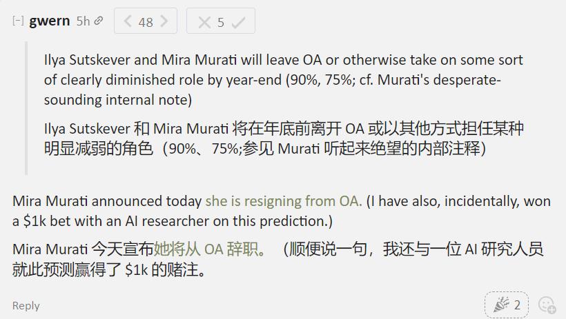 在2023年11月的风波之时,就有网友预测,联合创始人、首席科学家Ilya Sutskever和首席技术官Mira Murati,将在年底之前离开OA,或以某种明显减少的角色继续工作(90%,75%)。