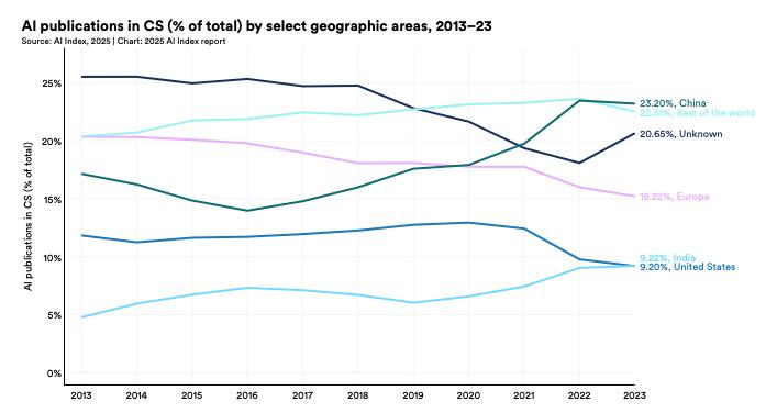 根据斯坦福大学最新发布的人工智能指数(Stanford HAI 2025),2013年-2023年,全球发表的AI论文总数增长了近三倍,其中,来自中国的AI论文占比从2013年的约12%几乎翻倍至2023年的23.2%,在所有地区中位列第一[3]。